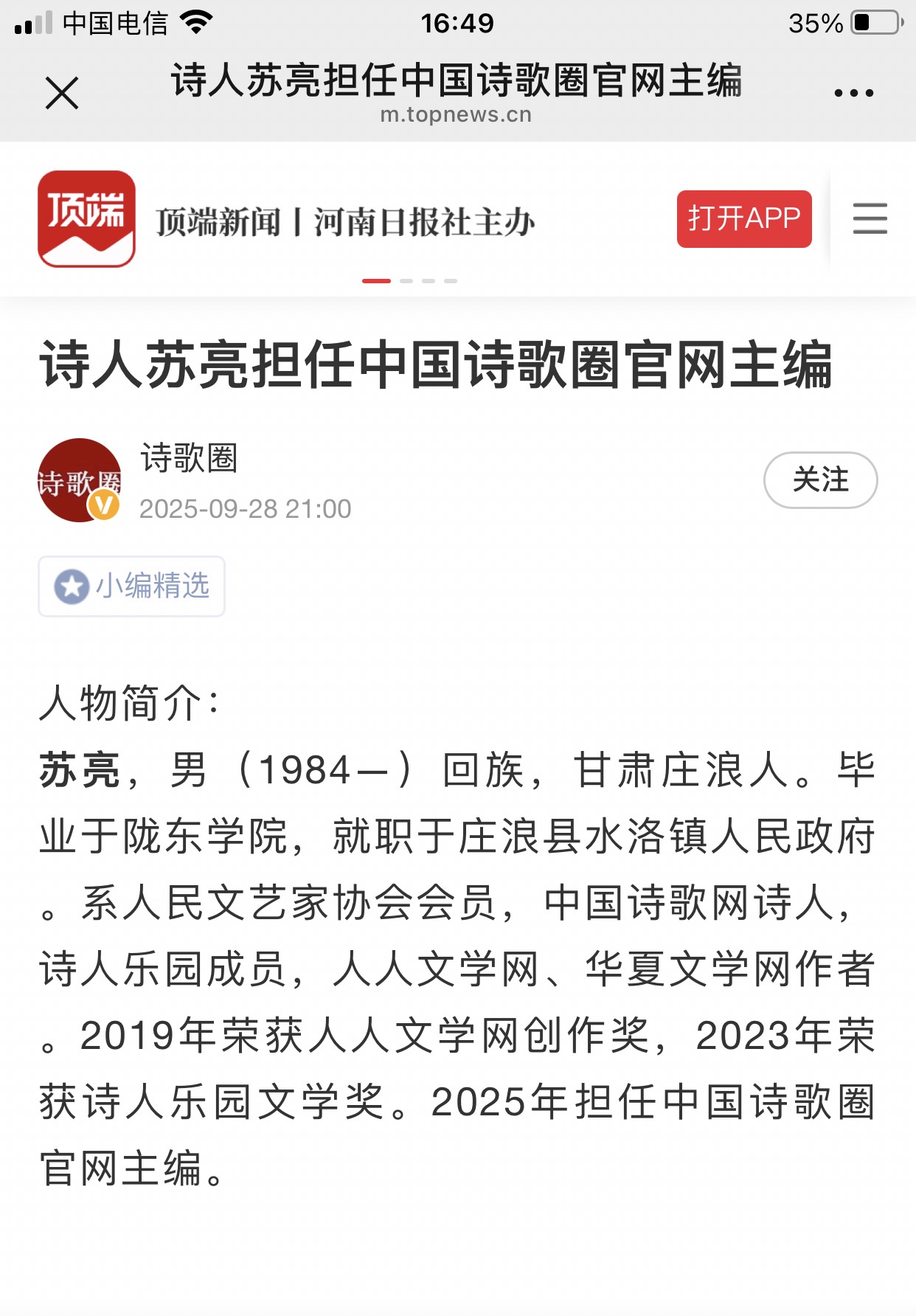甘肃诗人苏亮担任中国诗歌圈官网执行主编
